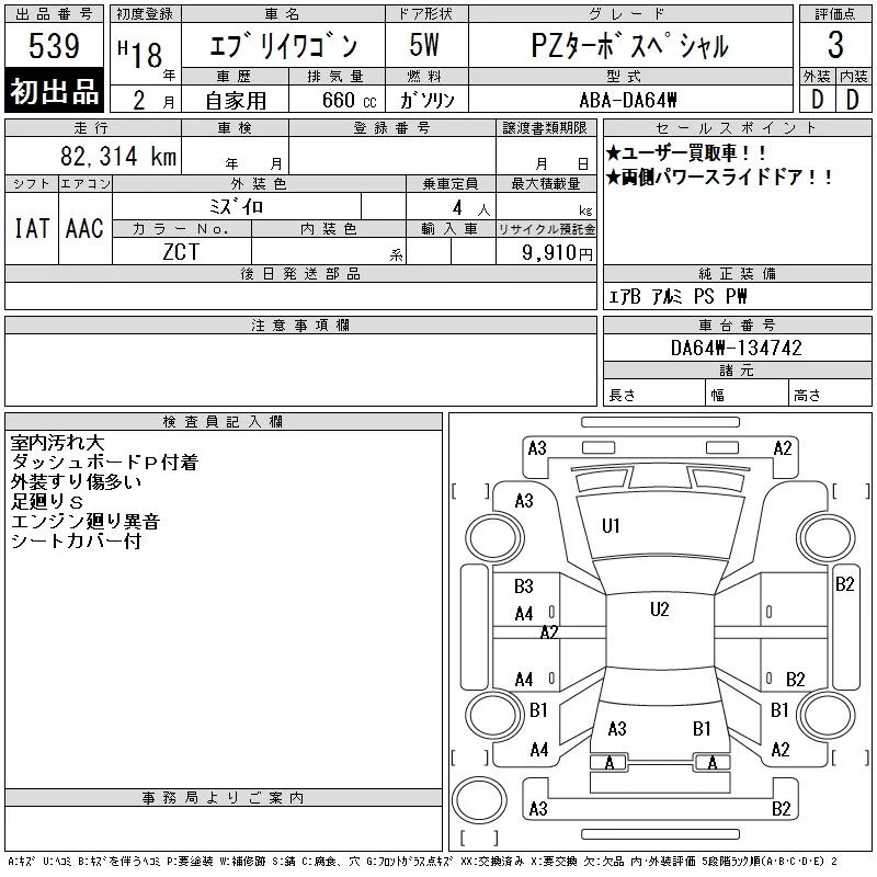 Suzuki EVERY WAGON с аукциона Японии CAA Tokyo лот № 539