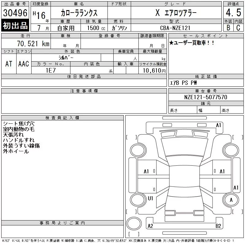 Toyota COROLLA RUNX с аукциона Японии CAA Tokyo лот № 30496