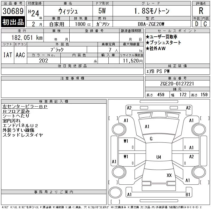 Toyota WISH с аукциона Японии CAA Tokyo лот № 30689