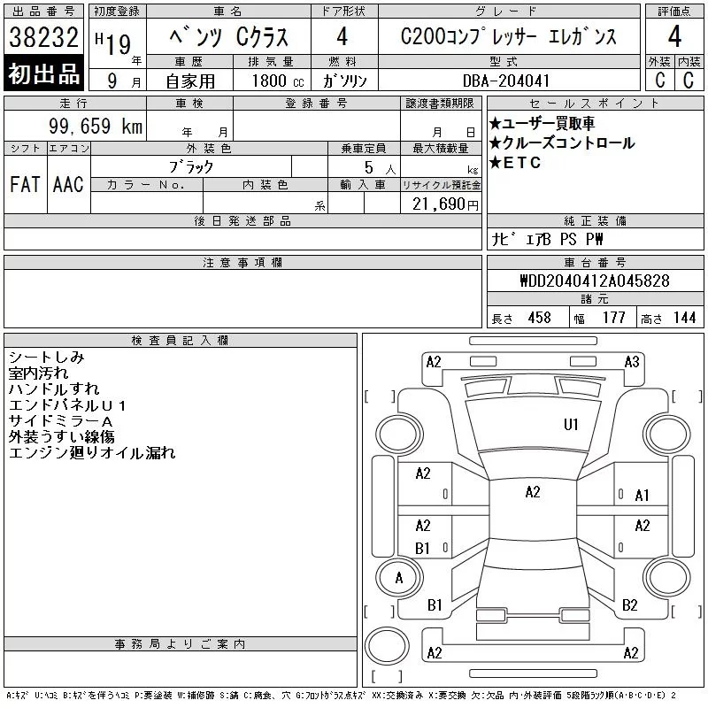 Mercedes-Benz C CLASS с аукциона Японии CAA Tokyo лот № 38232