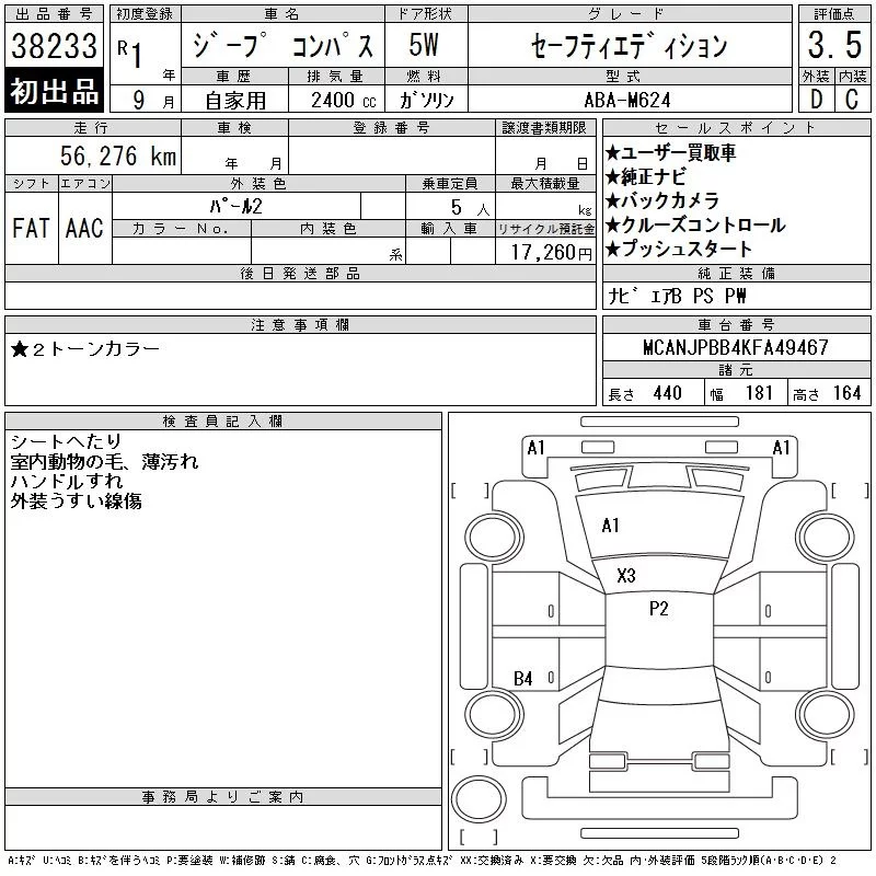 Chrysler JEEP COMPASS с аукциона Японии CAA Tokyo лот № 38233