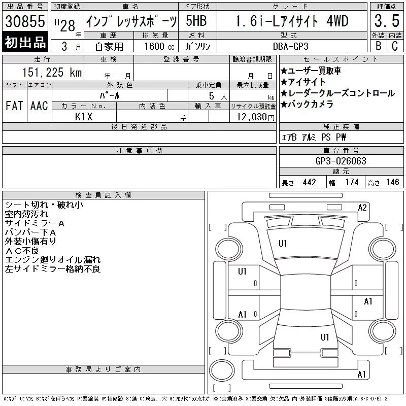Subaru IMPREZA с аукциона Японии CAA Tokyo лот № 30855