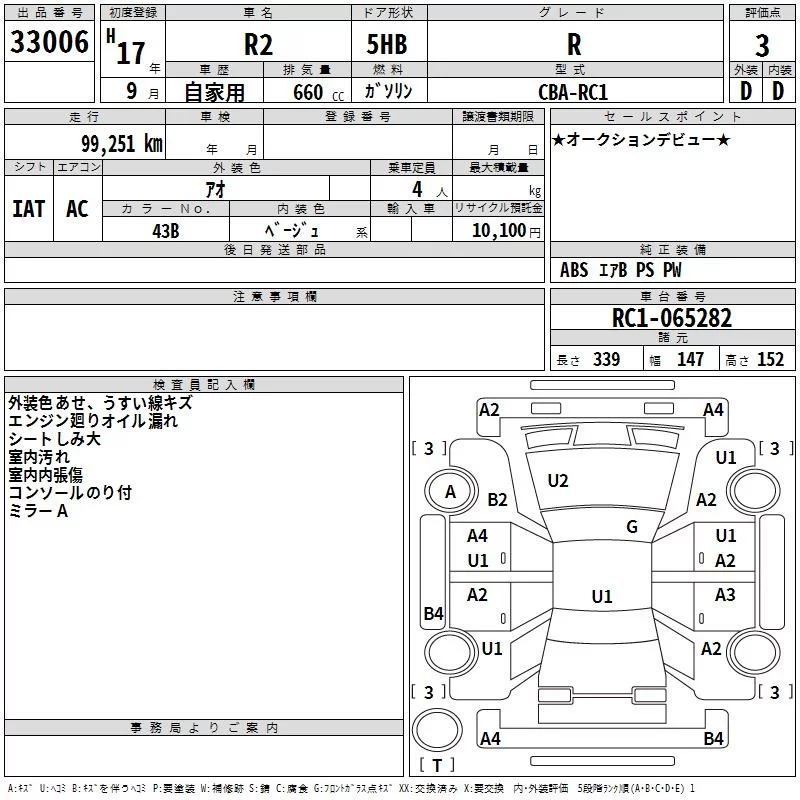Subaru R2 с аукциона Японии TAA Kyushu лот № 33006