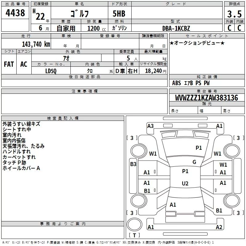 Volkswagen GOLF с аукциона Японии TAA Kyushu лот № 4438