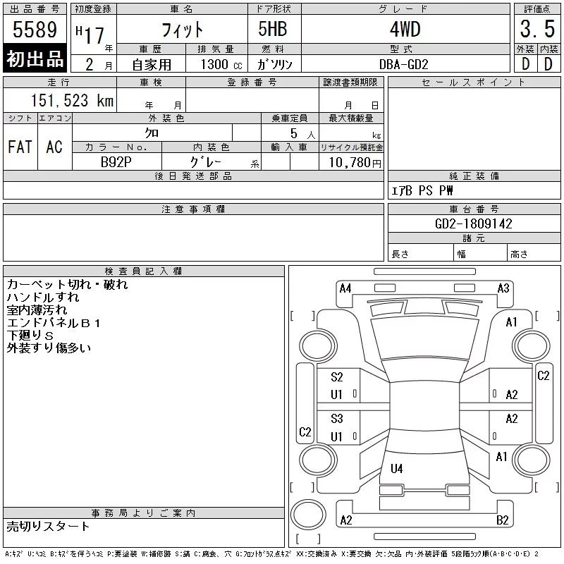 Honda FIT с аукциона Японии CAA Tohoku лот № 5589