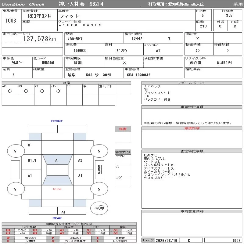 Honda FIT с аукциона Японии ORIX Kobe Nyusatsu лот № 1003