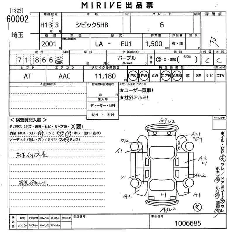 Honda CIVIC с аукциона Японии MIRIVE Saitama лот № 60002