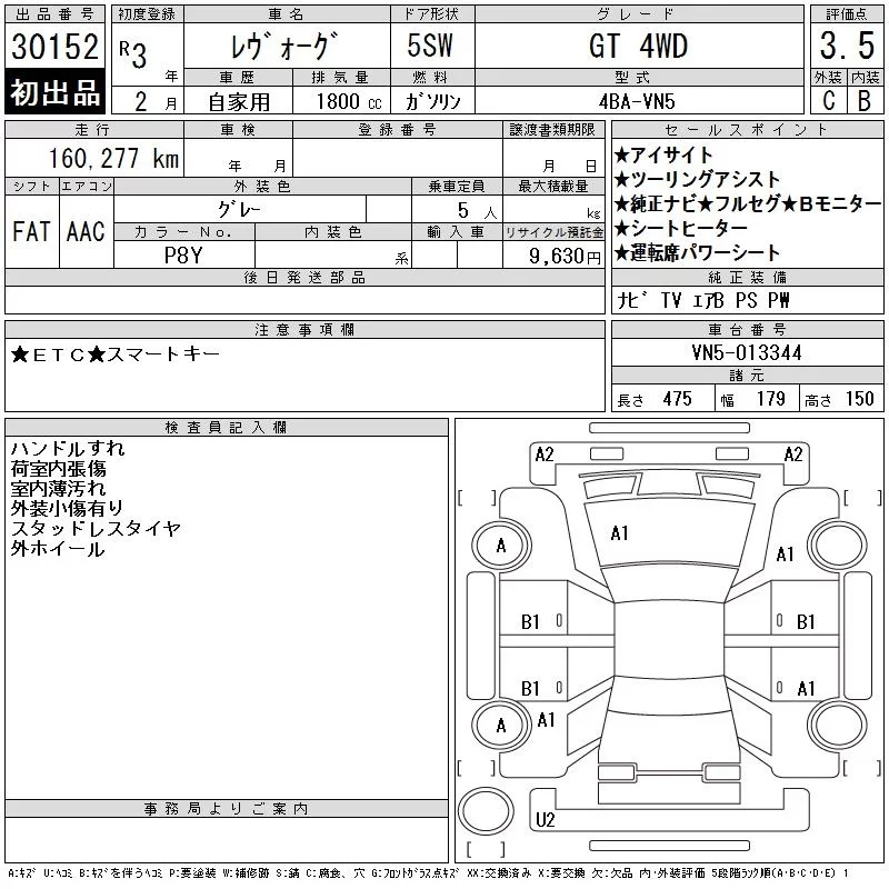 Subaru LEVORG с аукциона Японии CAA Chubu лот № 30152