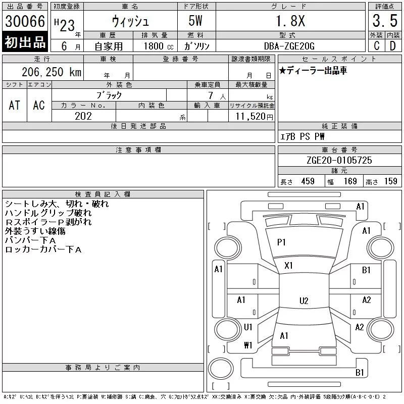 Toyota WISH с аукциона Японии CAA Chubu лот № 30066