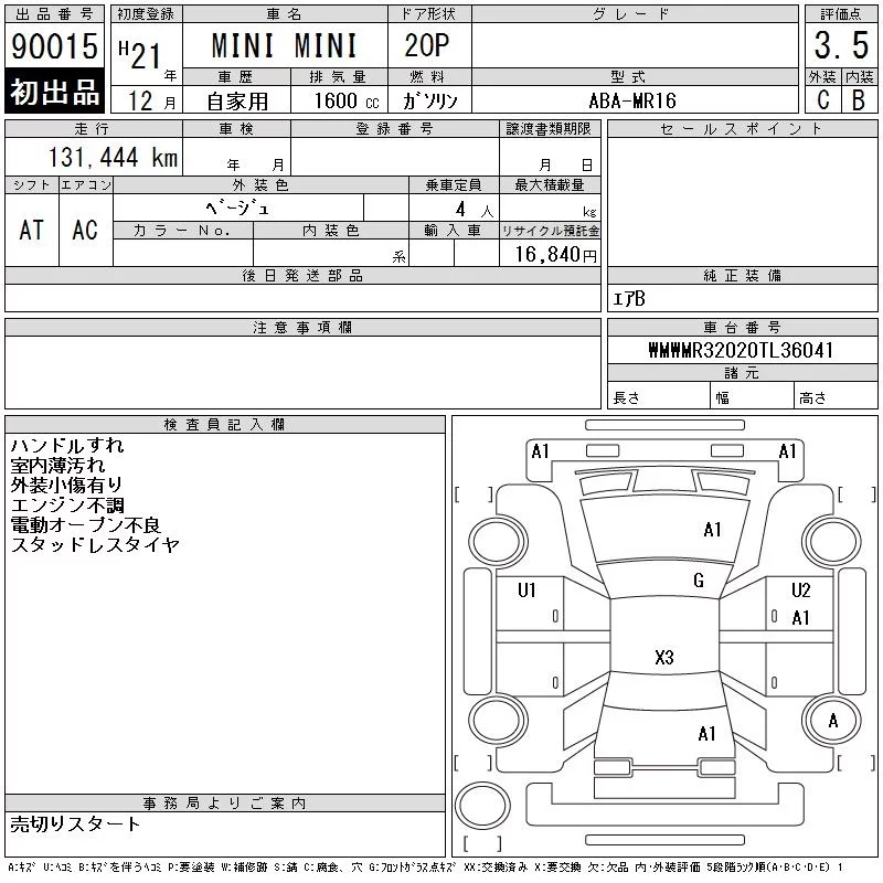 BMW MINI с аукциона Японии CAA Chubu лот № 90015