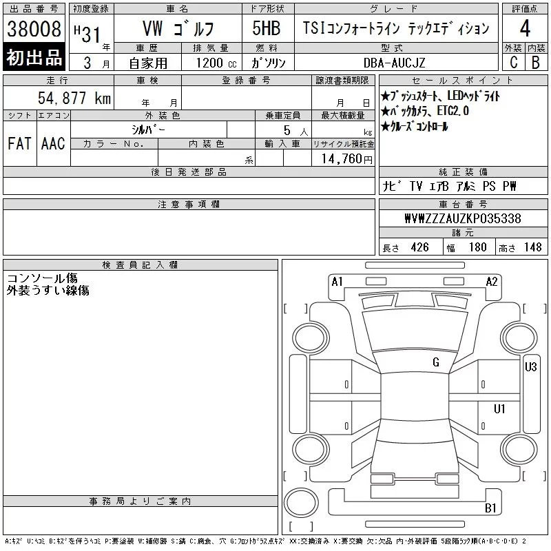 Volkswagen GOLF с аукциона Японии CAA Chubu лот № 38008