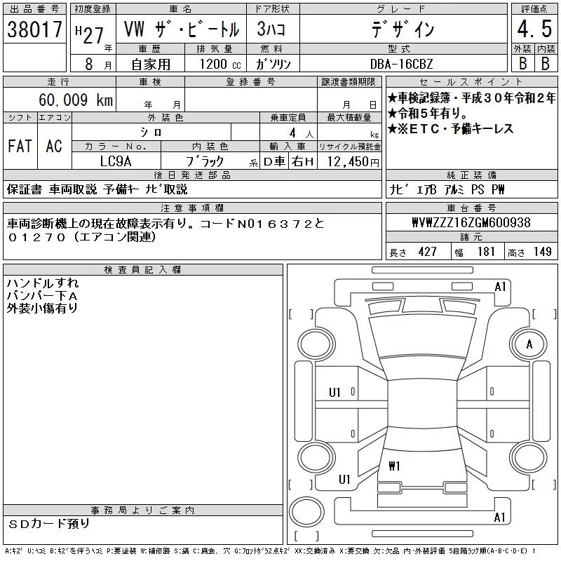Volkswagen THE BEETLE с аукциона Японии CAA Chubu лот № 38017