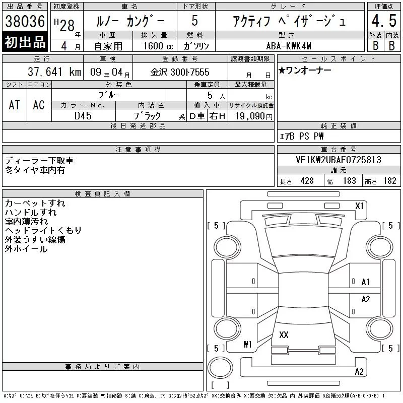Renault KANGOO с аукциона Японии CAA Chubu лот № 38036