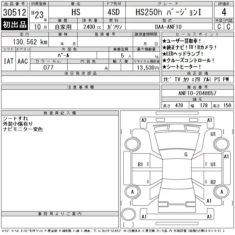 Lexus HS с аукциона Японии CAA Chubu лот № 30512