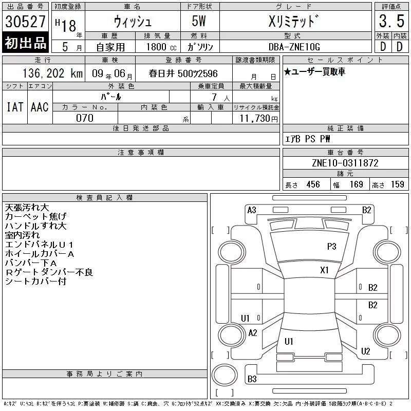Toyota WISH с аукциона Японии CAA Chubu лот № 30527