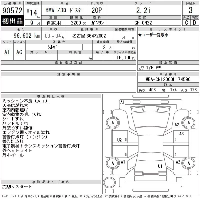 BMW Z3 SERIES с аукциона Японии CAA Chubu лот № 90572