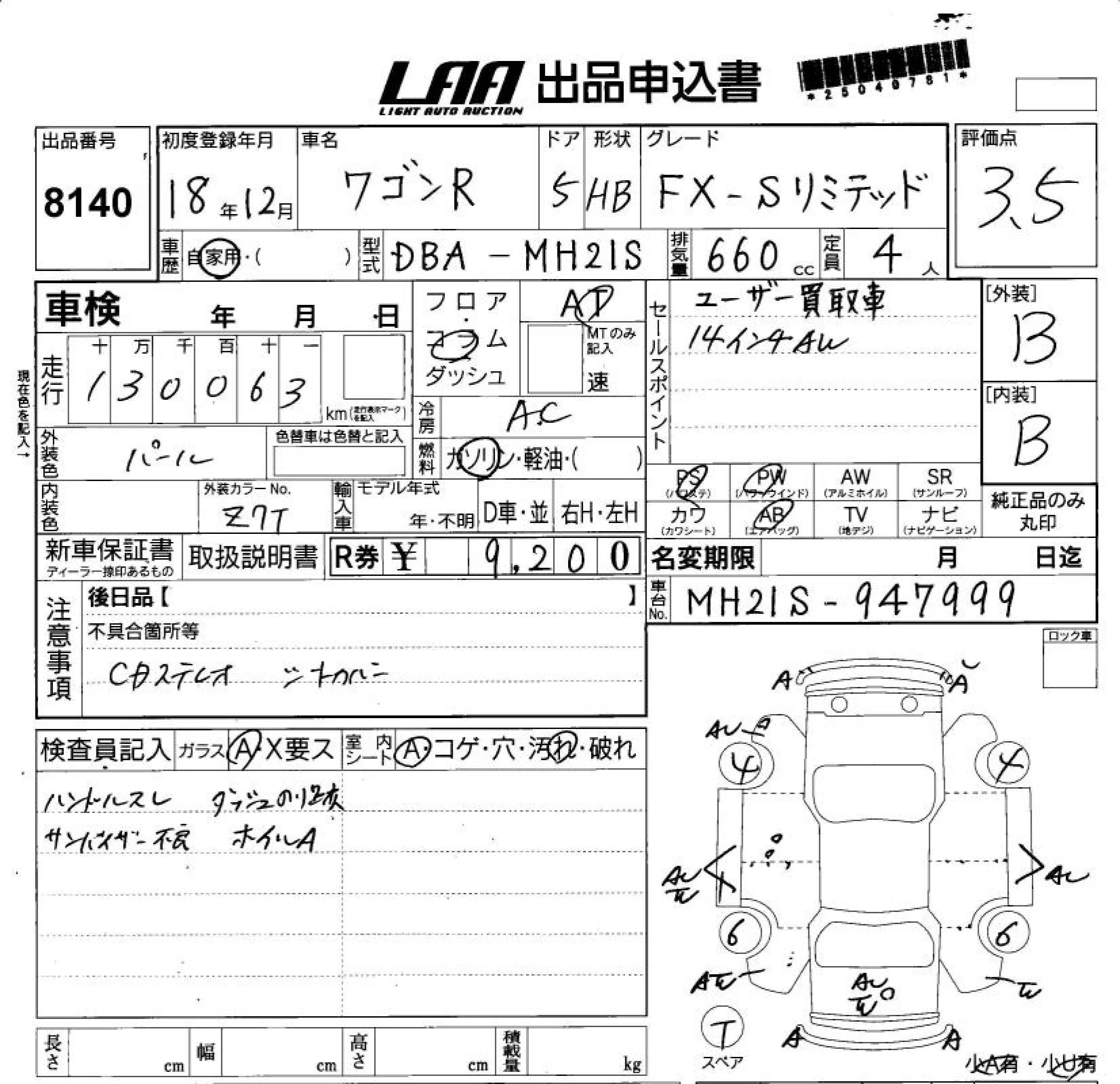 Аукционный лист  WAGON R лот № 8140