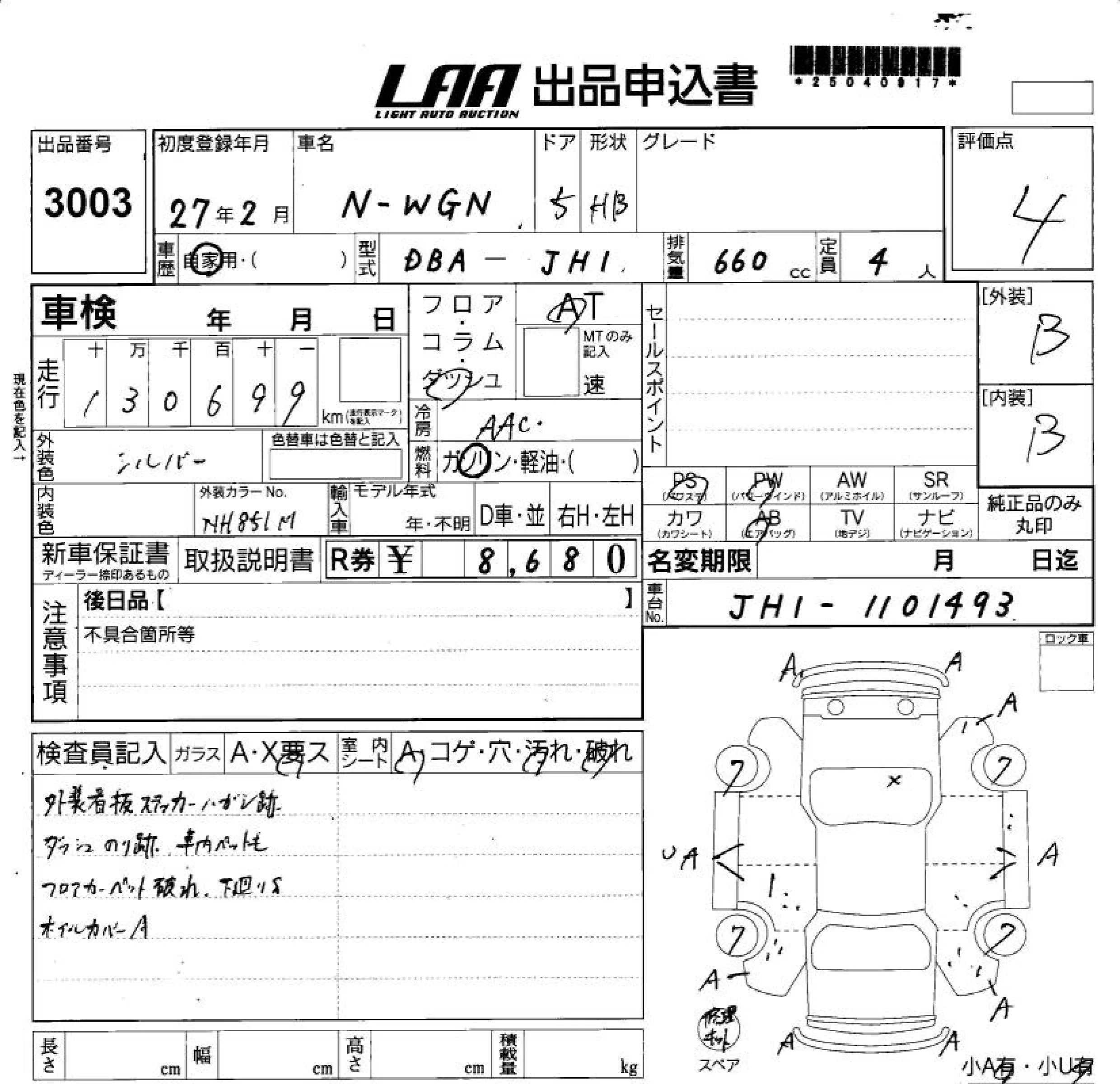 Honda N WGN с аукциона Японии LAA Shikoku лот № 3003