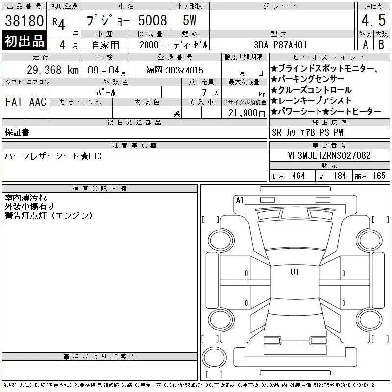 Peugeot 5008 с аукциона Японии CAA Chubu лот № 38180