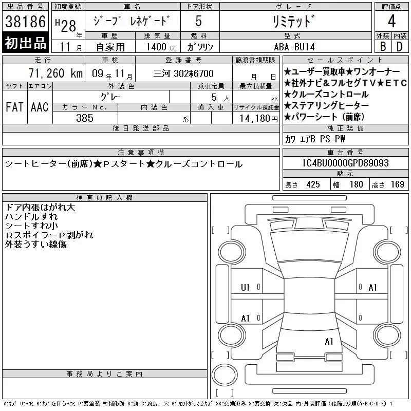 Chrysler JEEP RENEGADE с аукциона Японии CAA Chubu лот № 38186