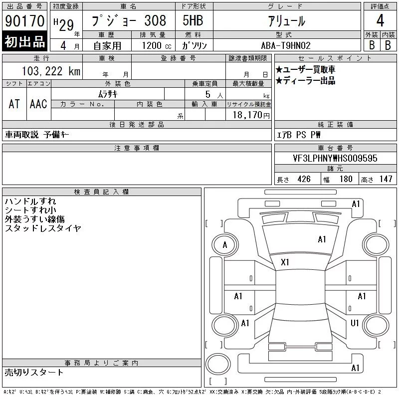 Peugeot 308 с аукциона Японии CAA Chubu лот № 90170