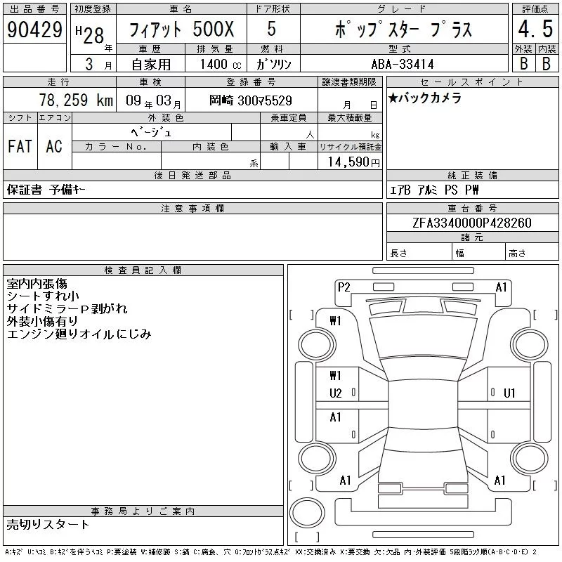 Fiat 500X с аукциона Японии CAA Chubu лот № 90429