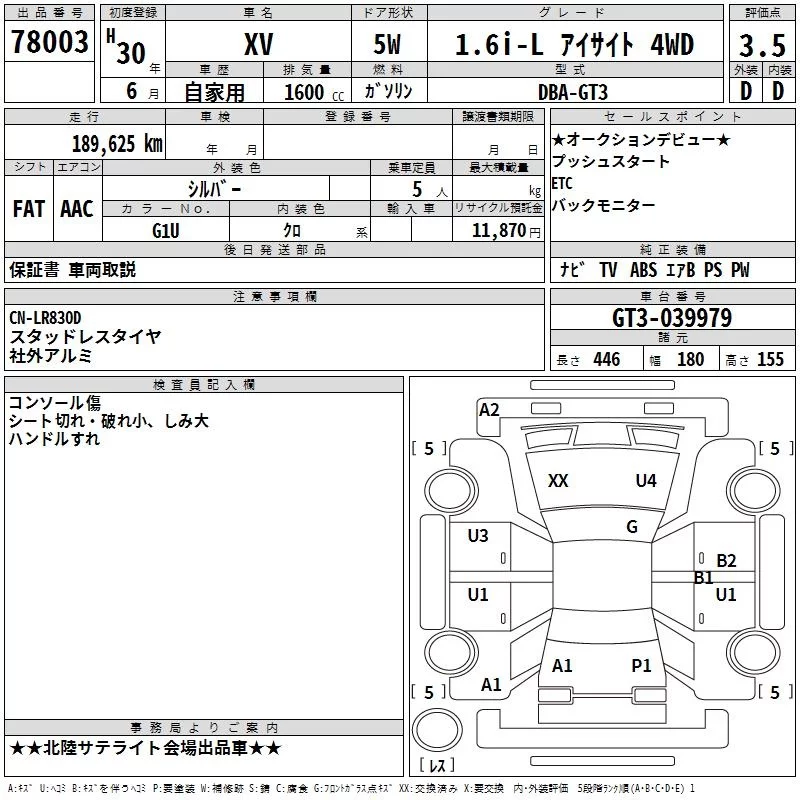 Subaru XV с аукциона Японии TAA Chubu лот № 78003
