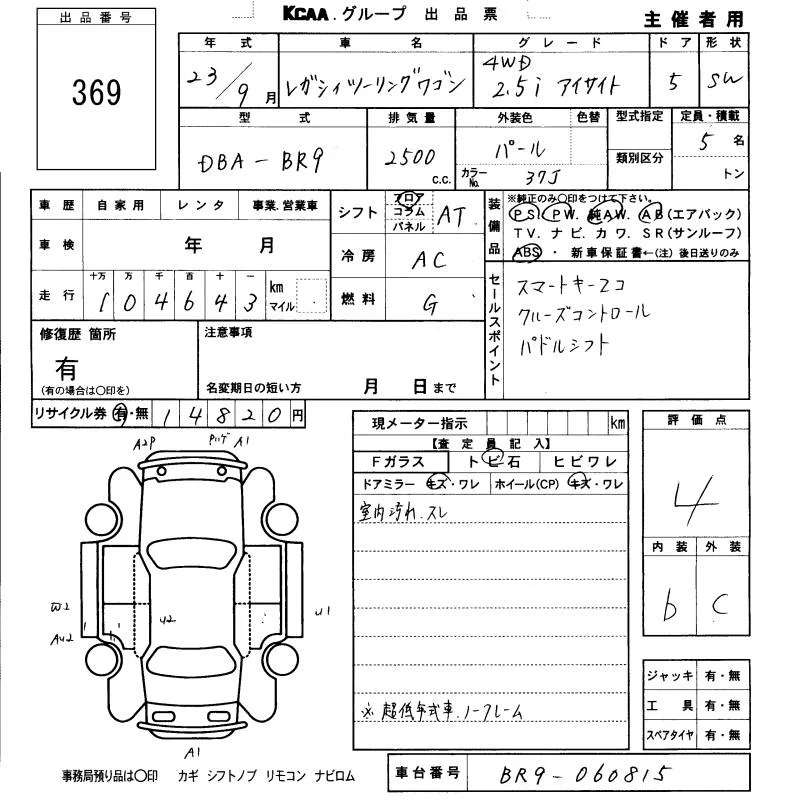 Subaru LEGACY с аукциона Японии KCAA Fukuoka лот № 369
