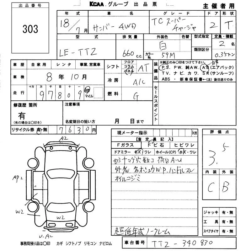 Subaru SAMBAR с аукциона Японии KCAA Fukuoka лот № 303