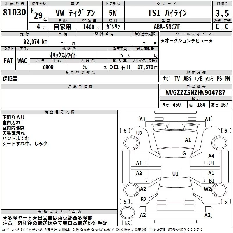 Volkswagen Tiguan с аукциона Японии TAA Kanto лот № 81030