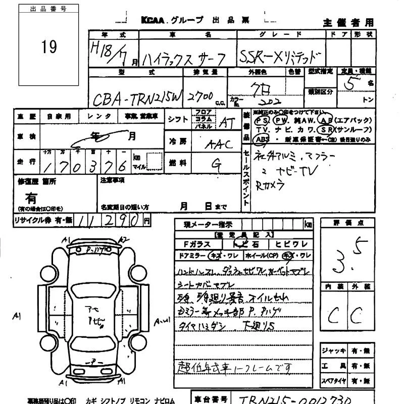 Toyota HILUX SURF с аукциона Японии KCAA Fukuoka лот № 19