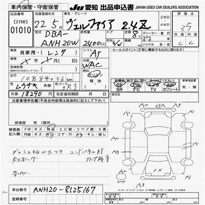 Toyota VELLFIRE с аукциона Японии JU Aichi лот № 1010