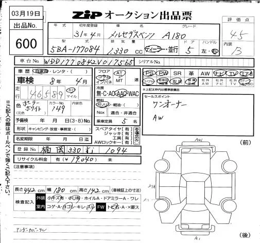Mercedes-Benz A CLASS с аукциона Японии ZIP Osaka лот № 600