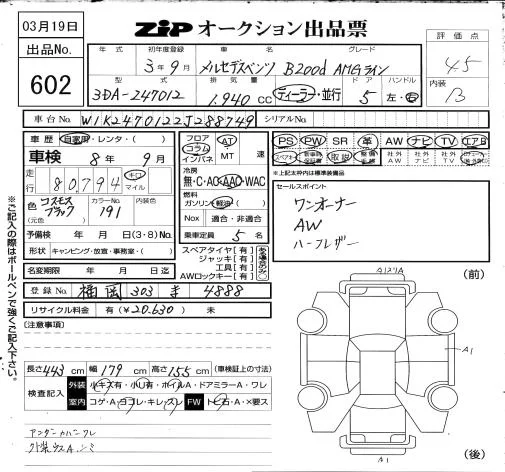 Mercedes-Benz B CLASS с аукциона Японии ZIP Osaka лот № 602