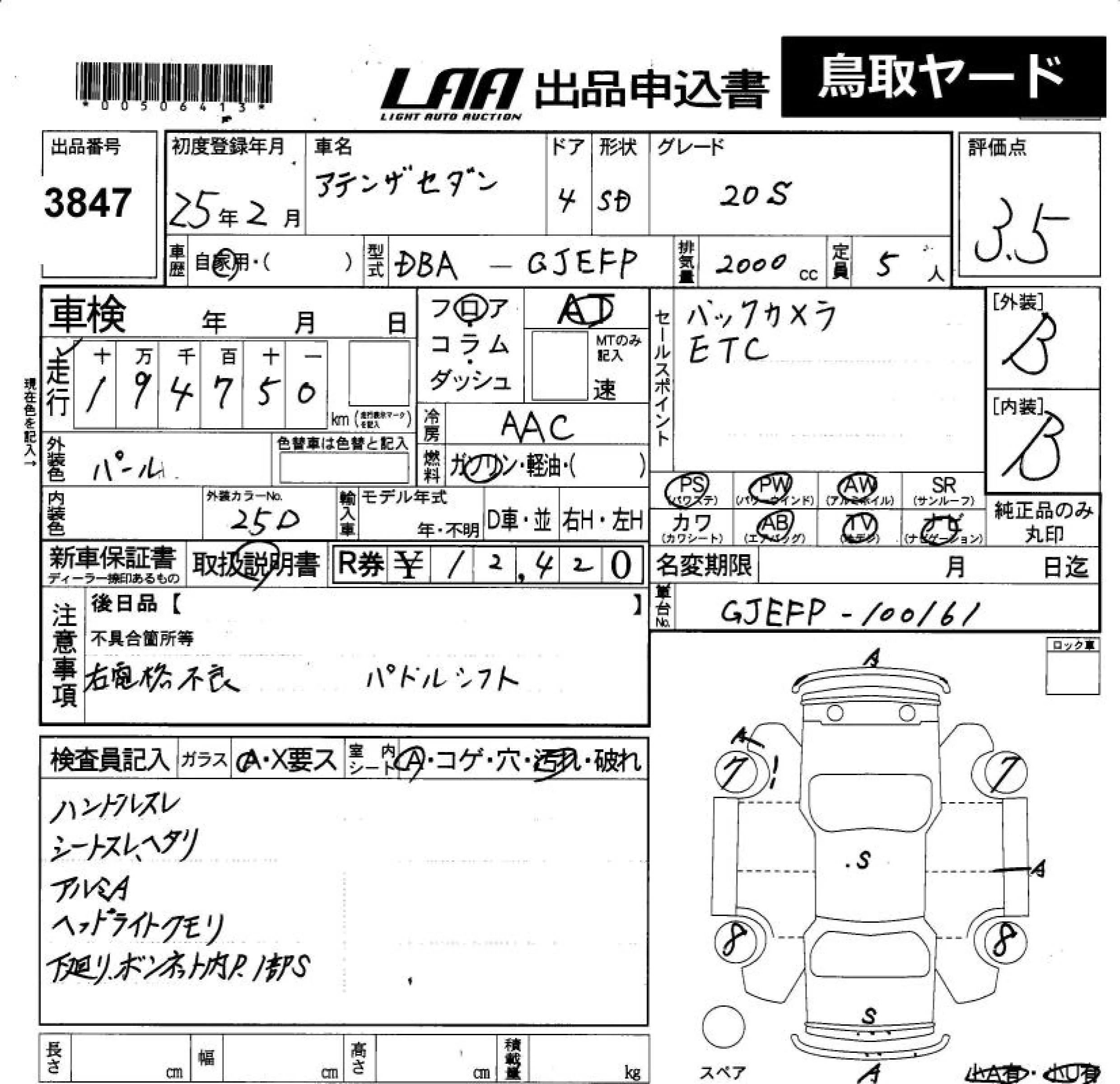 Mazda ATENZA SEDAN с аукциона Японии LAA Okayama лот № 3847
