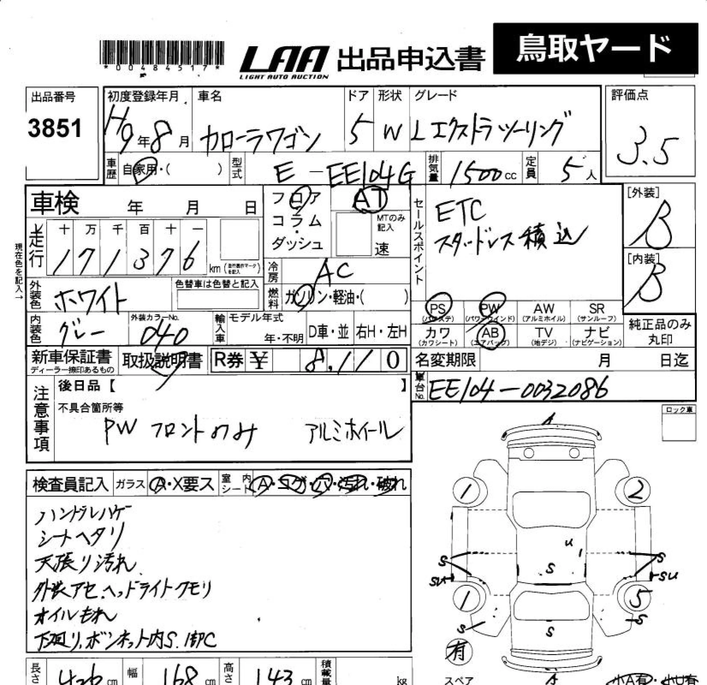 Toyota COROLLA TOURING WAGON с аукциона Японии LAA Okayama лот № 3851