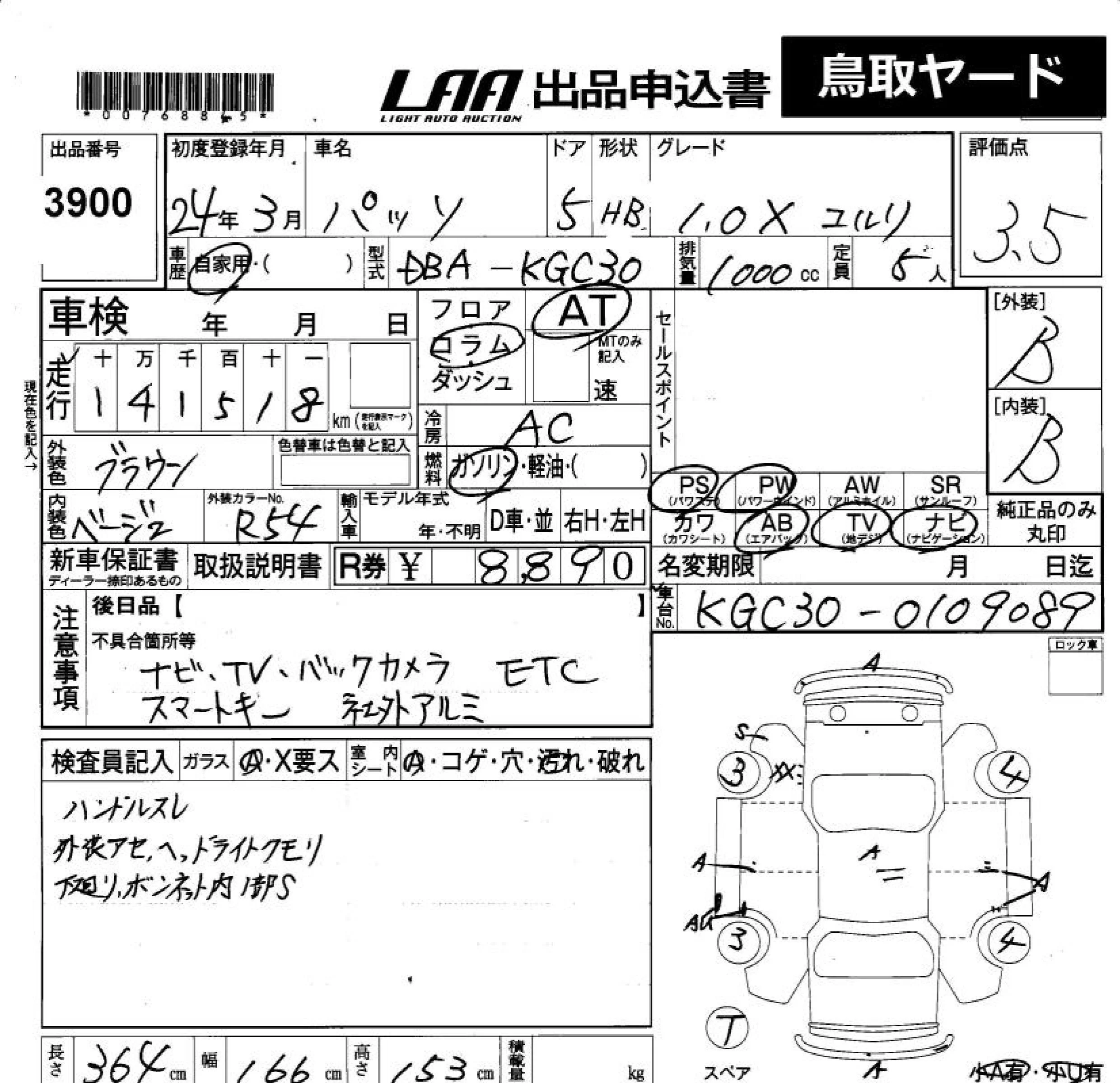 Toyota PASSO с аукциона Японии LAA Okayama лот № 3900