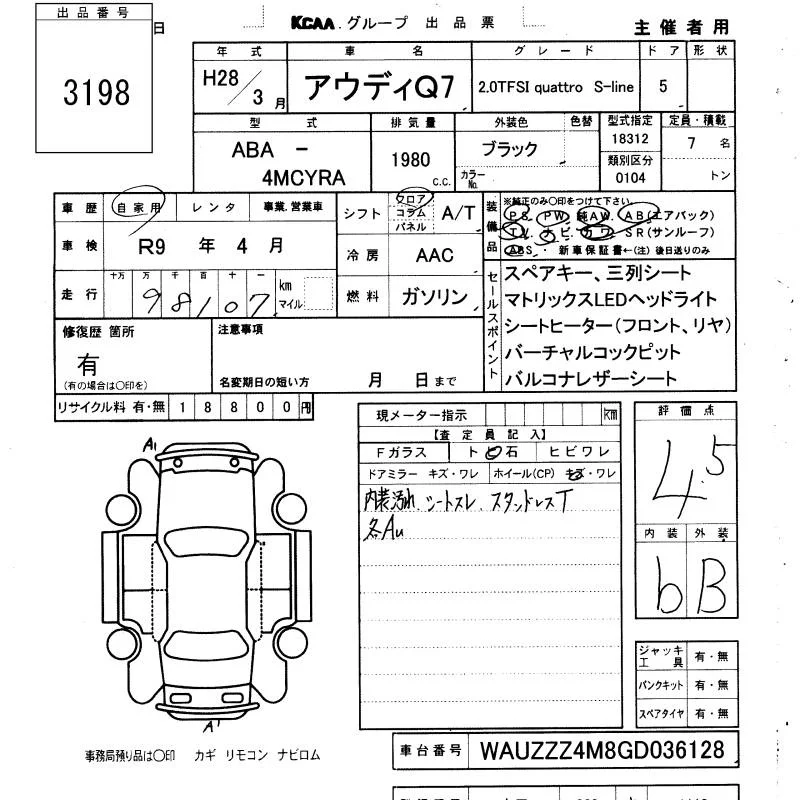 Audi Q7 с аукциона Японии KCAA Yamaguchi лот № 3198