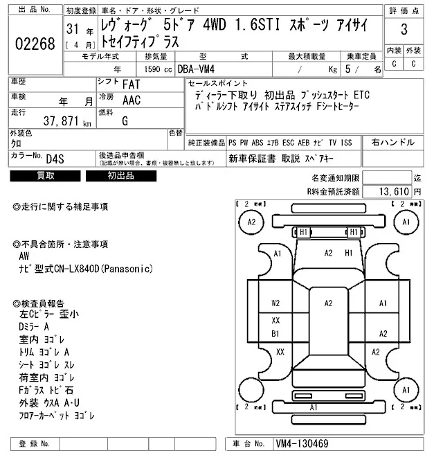 Subaru LEVORG с аукциона Японии ARAI Bayside лот № 2268