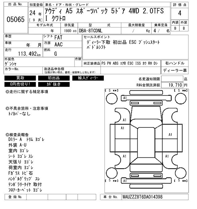 Audi A5 с аукциона Японии ARAI Bayside лот № 5065