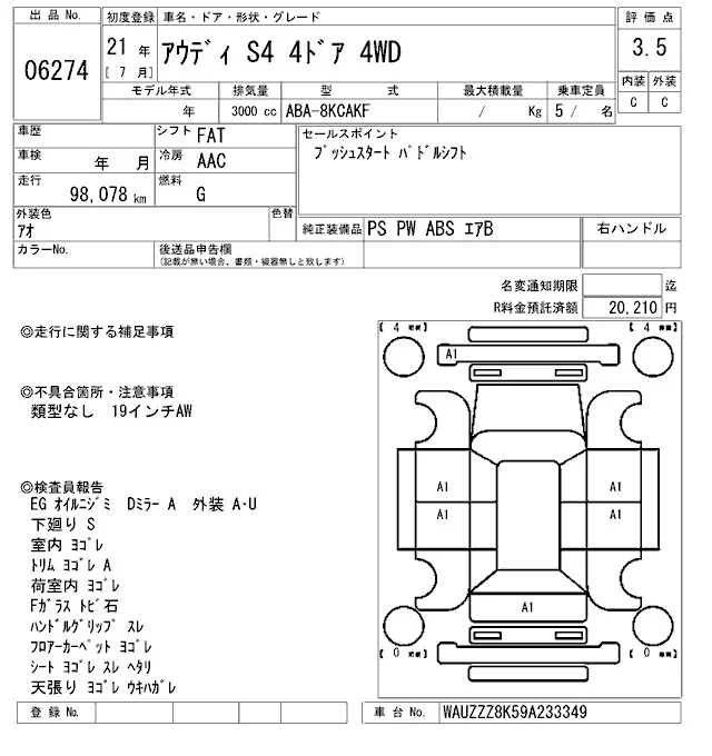 Audi S4 с аукциона Японии ARAI Sendai лот № 6274