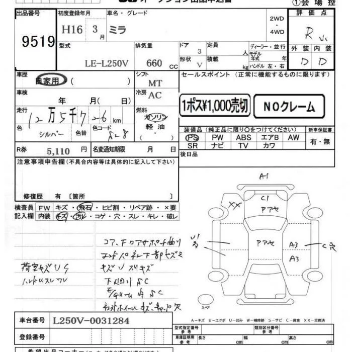 Daihatsu MIRA с аукциона Японии JU Chiba лот № 9519