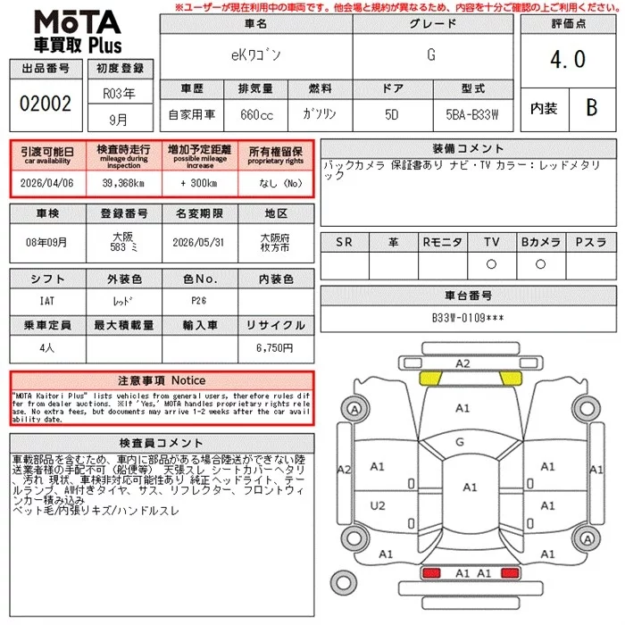 Mitsubishi EK WAGON с аукциона Японии MOTA Kuruma Kaitori Plus лот № 2002