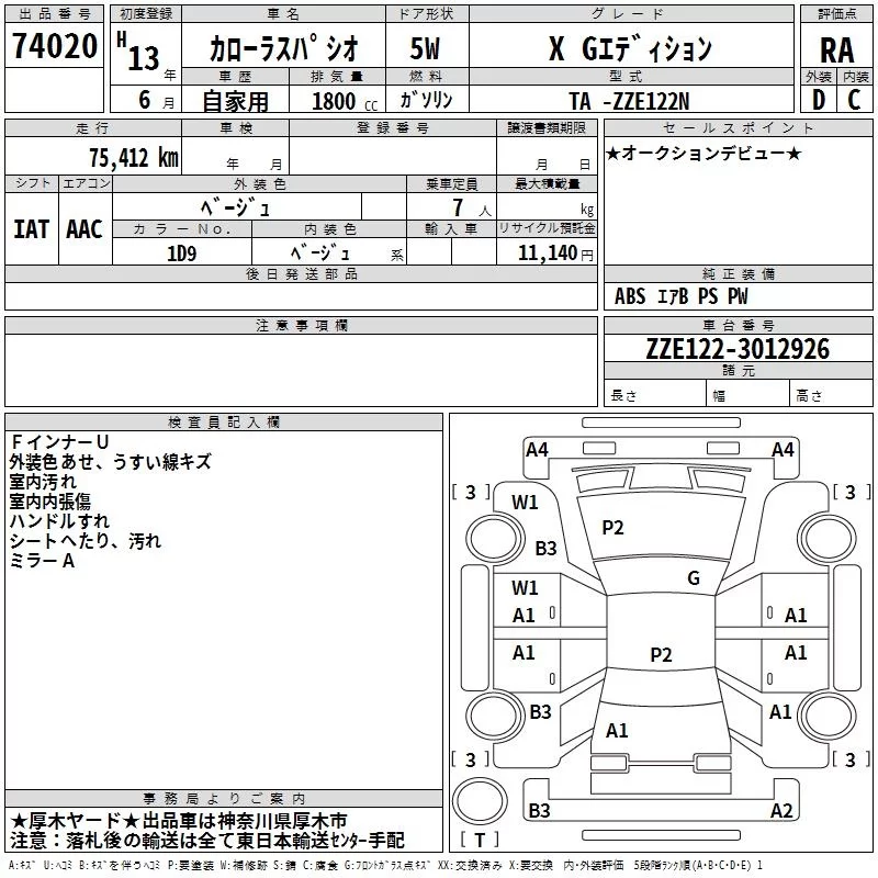 Toyota COROLLA SPACIO с аукциона Японии TAA Yokohama лот № 74020