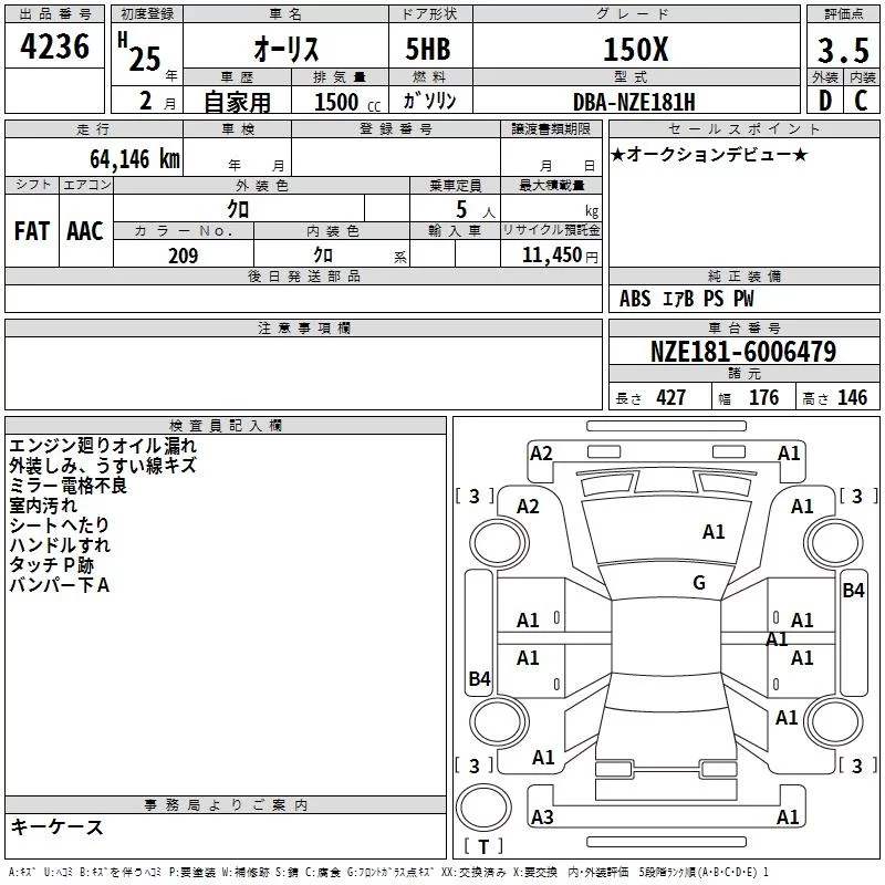 Toyota AURIS с аукциона Японии TAA Yokohama лот № 4236