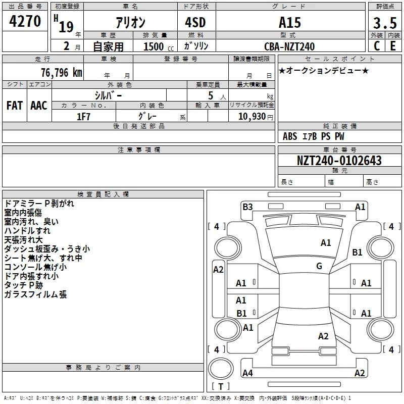 Toyota ALLION с аукциона Японии TAA Yokohama лот № 4270