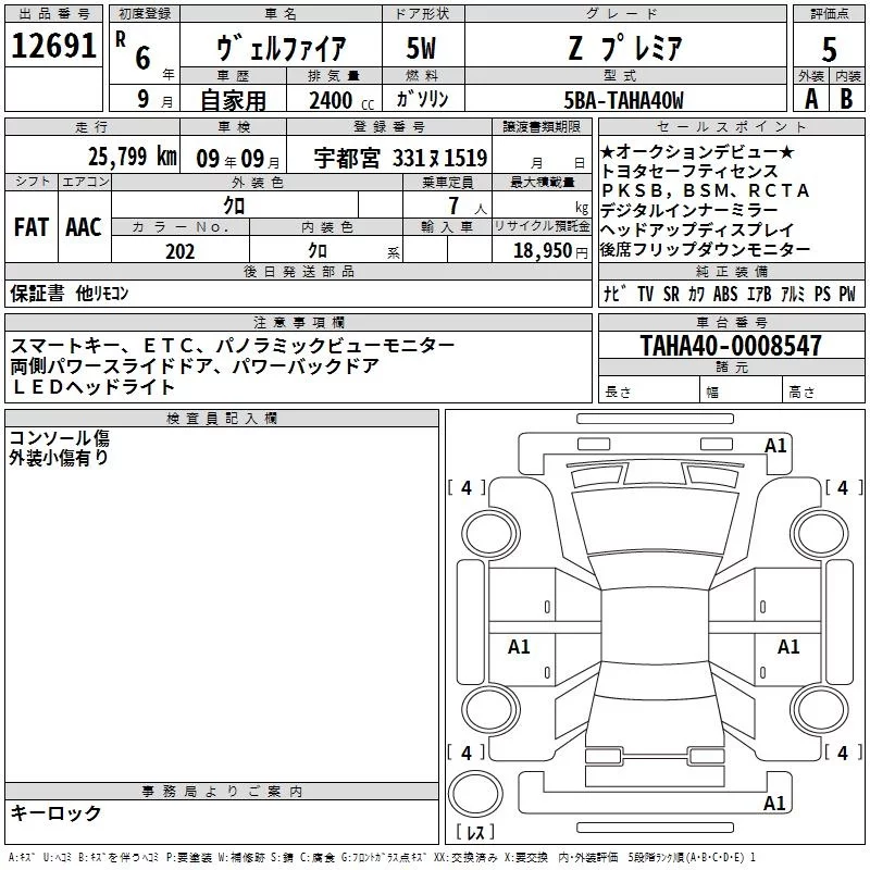 Toyota VELLFIRE с аукциона Японии TAA Yokohama лот № 12691