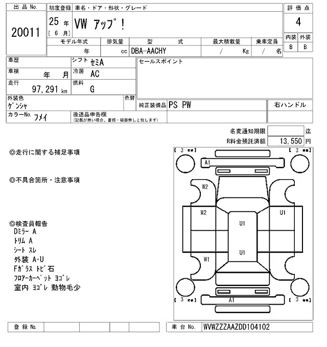Volkswagen UP с аукциона Японии ARAI Oyama VT лот № 20011