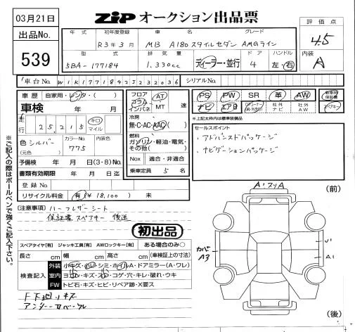 Mercedes-Benz A CLASS с аукциона Японии ZIP Tokyo лот № 539