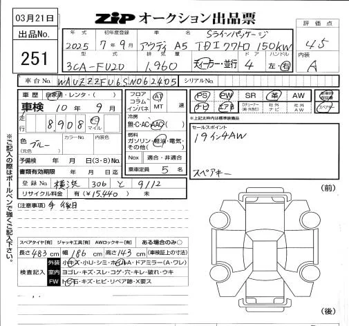 Audi A5 с аукциона Японии ZIP Tokyo лот № 251